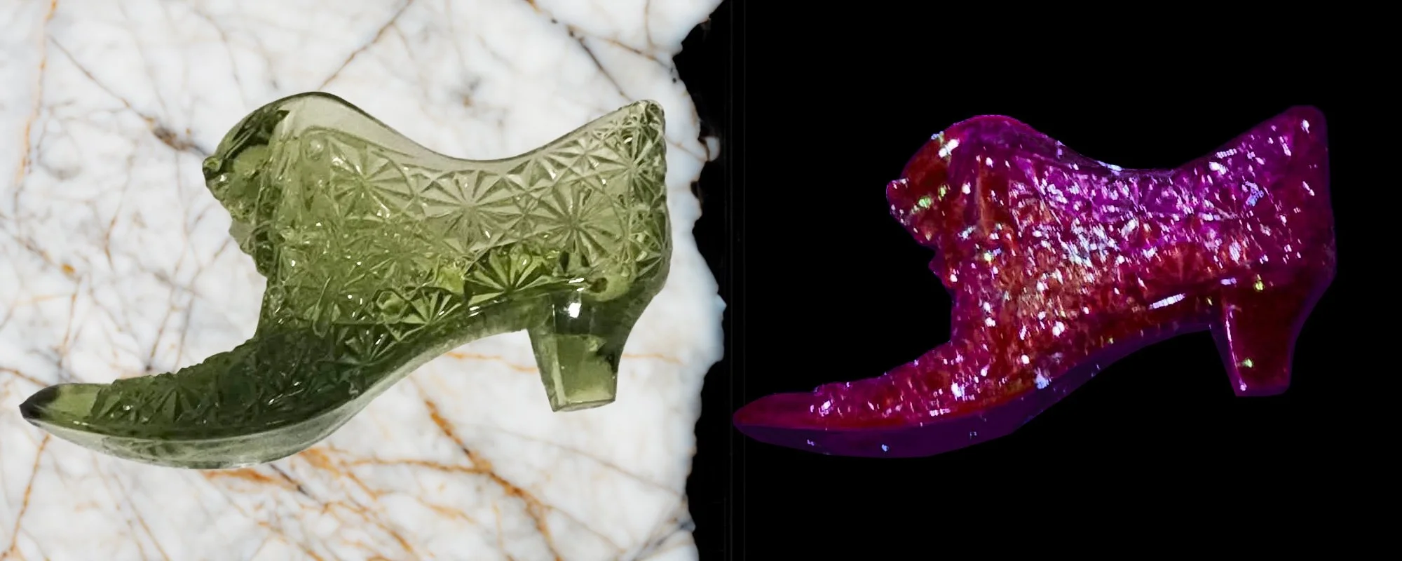 Uranium Ghost Glowers: For every rule there is an exception. While nearly all uranium glass will glow brightly under 395nm UV light every once in a while you may come across a piece that really only seems to react under 365nm. Macbeth Evans was one of the most notable glass makers to produce these “ghostly glowers”. But, this is where is gets tricky! Because manganese also fluoresces under a 365nm light, the only way to positively confirm if something is Uranium Milk Glass is to test is with a geiger counter.